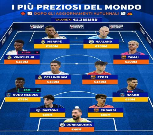 在完成最新一次身价更新后,德国转会市场网站列出了世界足坛最贵阵容,皇马、巴萨各3人,曼城、巴黎各2人,国米1人...