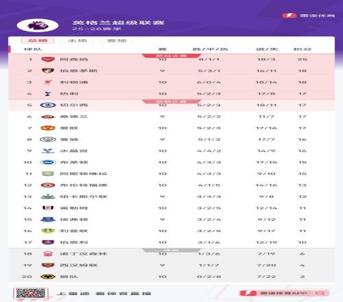 雷速体育11月2报道 英超第10轮比赛已经7场战罢。最新积分榜方面,阿森纳8胜1平1负,目前以25分领跑。伯恩茅斯少赛一轮落后榜首7分,暂居次席。