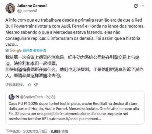 引擎认证的倒计时压力之外,另一大焦点便是红牛为何突然与法拉利两大车队的意外联手?昨晚,巴西名记Julianne带来重磅爆料:红牛的倒戈并非单纯的规则共识,而是他们无法复制梅赛德斯的引擎技术,在技术追赶无果的情况下,才选择将梅赛德斯引擎的相关秘密泄露出去。