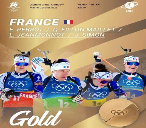 冬季两项4x6公里混合接力,法国队夺得冠军,这也是法国代表团在本届冬奥会上的首枚金牌,意大利队和德国队分别获得银牌和铜牌。