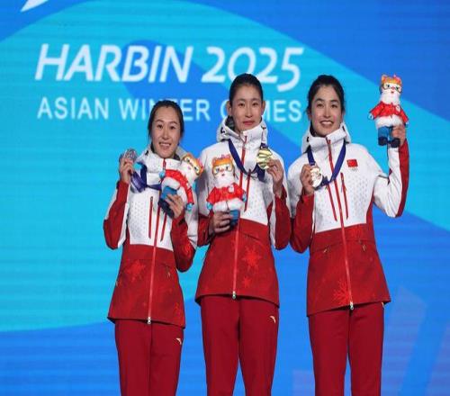 2025年2月8日,在哈尔滨第九届亚冬会越野滑雪女子个人短距离(传统技术)决赛中,中国选手李磊以3分25秒25摘得金牌。她的队友孟红莲、迪妮格尔·衣拉木江分获二、三名。图为颁奖仪式。 中新社记者 富田 摄。视觉中国 图