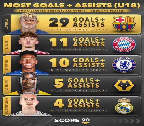 本赛季五大联赛U18球员直接参与进球TOP5: