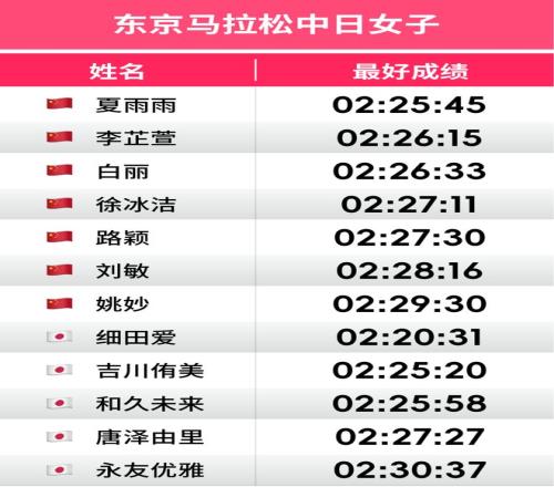 就读于清华大学体育社科学院的博士夏雨雨,在日本同样有过出色表现。2024年3月,她在名古屋跑出2:25:45,这一成绩仅次于张德顺的两次最佳,位列现役选手第三。