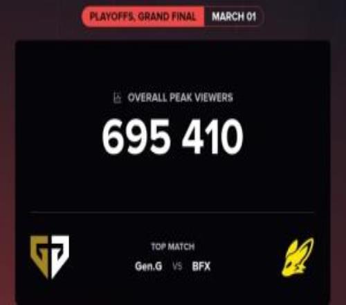 电竞体育03月02报道 数据网站公布了昨日2026LCK Cup总决赛GEN vs BFX的直播热度情况,本场Bo5观众峰值只有69.5w,连去年同期决赛热度的一半都不到。