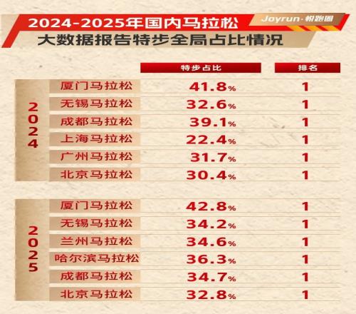 至于面向普通大众与进阶跑者的市场占有率方面,据悦跑圈数据显示,在2025年国内包含厦门、无锡、兰州、哈尔滨、成都、北京、上海、广州在内的多个核心城市的马拉松赛事中,特步跑鞋的全局穿着率毫无悬念地包揽了全部全品牌第一,可以说是没有任何争议的第一品牌。